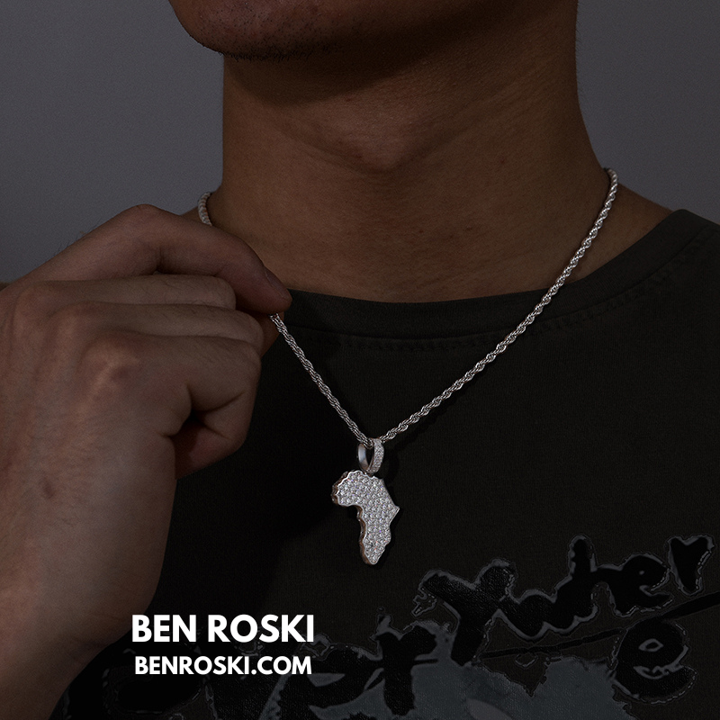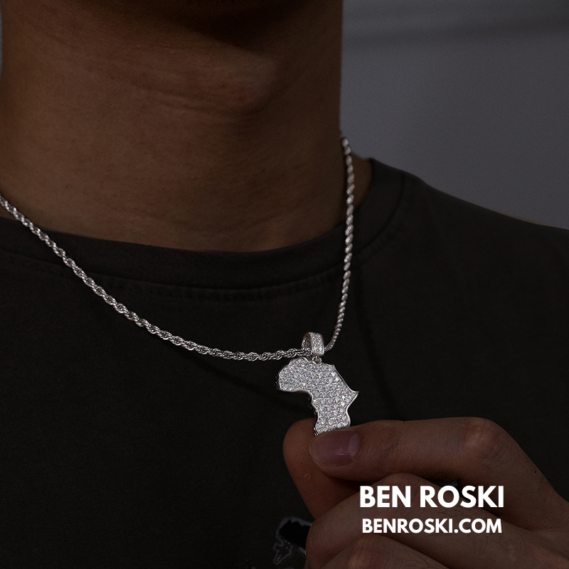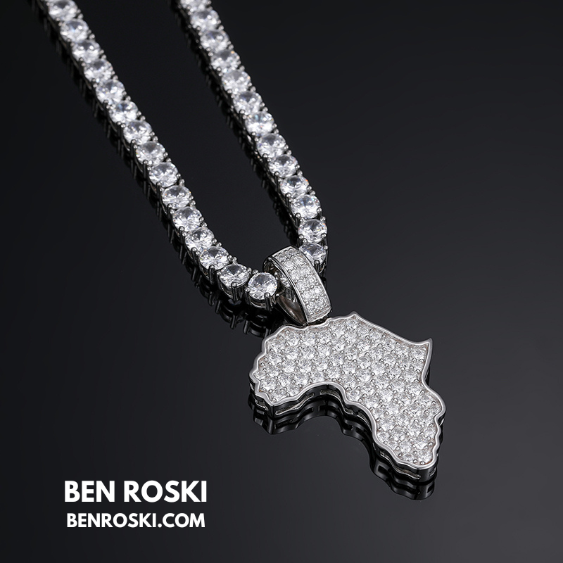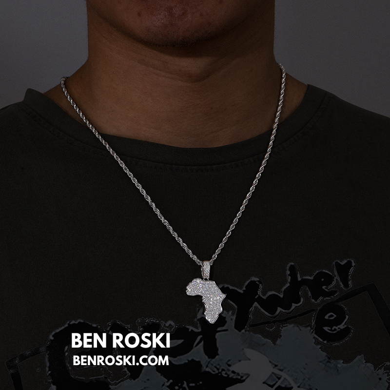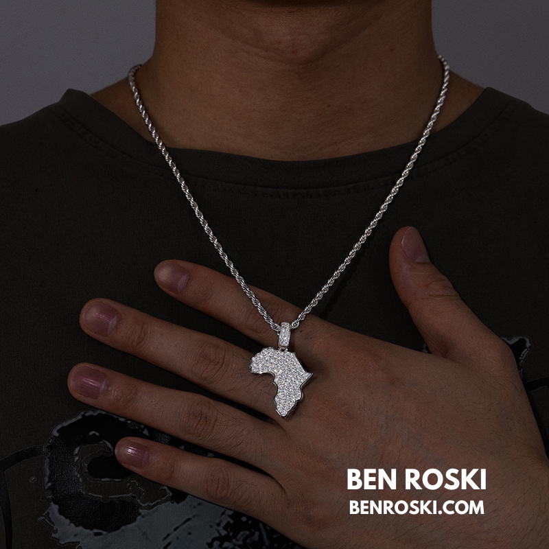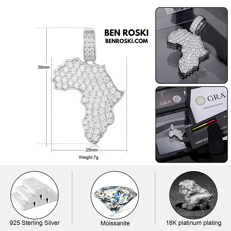 Celebrate heritage and luxury with the Africa Map Moissanite Pendant, crafted in solid S925 sterling silver and available in three premium finishes: Silver, Gold Plated, and Rose Gold Plated. This finely detailed pendant is fully iced with VVS moissanite stones, meticulously handset to create a flawless diamond-like brilliance.