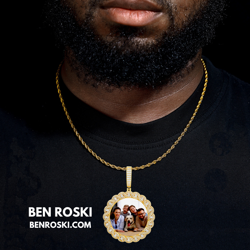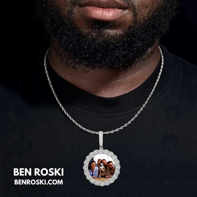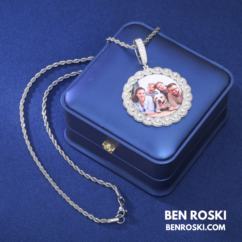 Turn your memories into a dazzling statement piece with our 71MM Custom Moissanite Photo Pendant, crafted in premium S925 sterling silver and available in Silver, Gold Plated, and Rose Gold Plated finishes. This pendant showcases your favorite photo at the center, surrounded by a luxurious scalloped halo of VVS Moissanite stones for maximum brilliance.