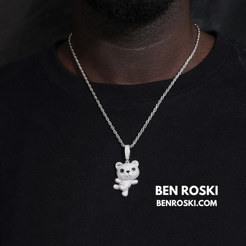 Bring playful luxury to your jewelry collection with the Dancing Teddy Bear Pendant, meticulously crafted in solid S925 sterling silver and available in silver, gold-plated, and rose gold-plated finishes. This charming 3D teddy bear design is fully iced with high-clarity VVS Moissanite stones for a brilliant, diamond-like sparkle that stands out from every angle.
