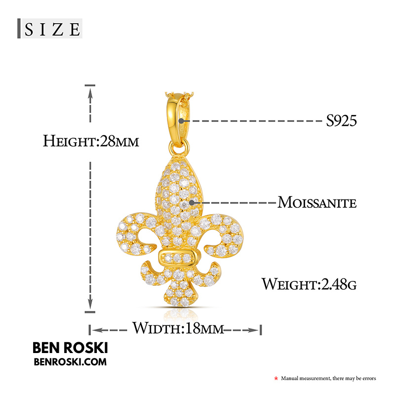 Elevate your jewelry collection with this timeless Fleur-de-Lis Moissanite Pendant, a symbol of elegance and royalty. Expertly crafted in solid 925 sterling silver, this pendant is available in classic silver, luxurious gold-plated, and romantic rose-gold-plated finishes, making it a versatile piece for any style.