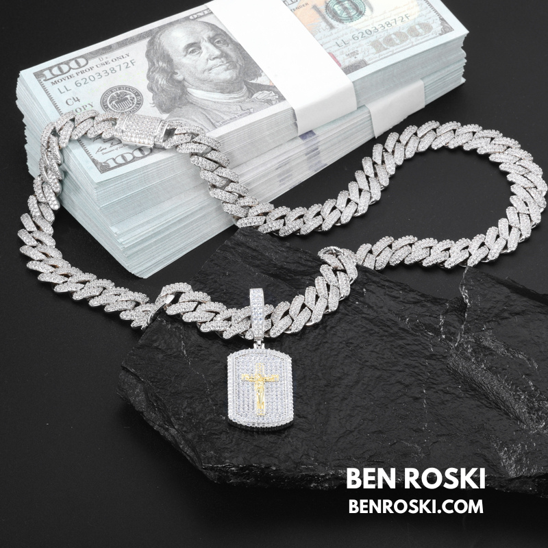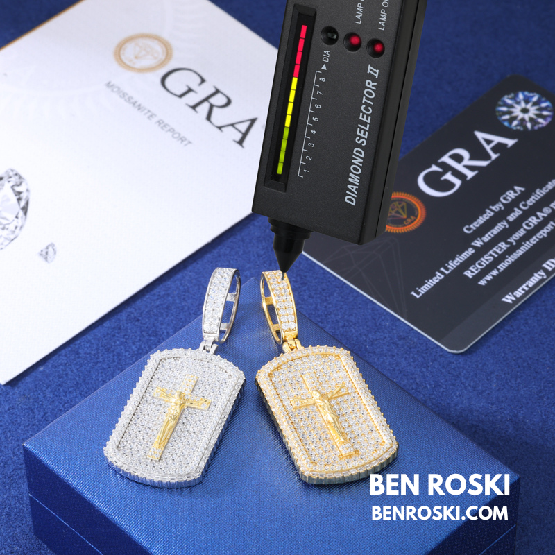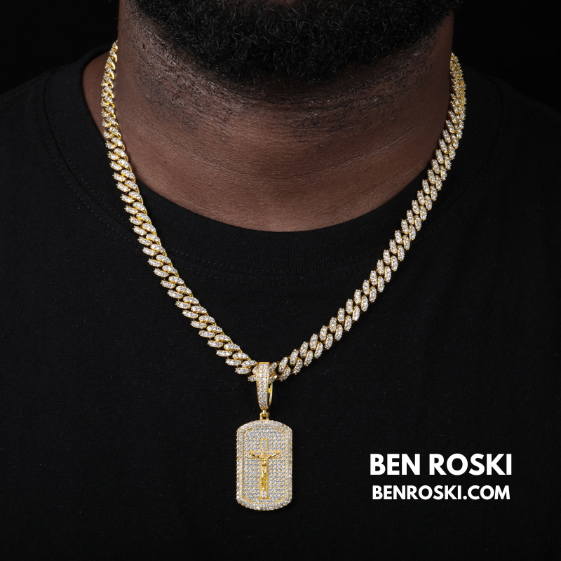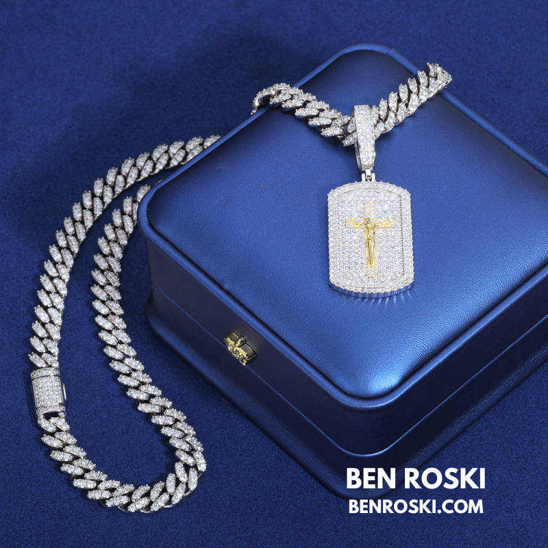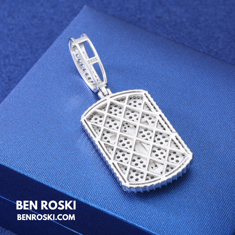 Make a bold statement of faith and luxury with the Crucifix Dog Tag Pendant by Ben Roski . Expertly crafted in solid S925 sterling silver and fully flooded with VVS moissanite stones, this pendant delivers exceptional brilliance and diamond-like fire. The elegant dog tag design showcases a beautifully detailed crucifix at the center, symbolizing strength and devotion while adding a striking visual contrast.