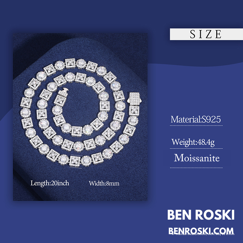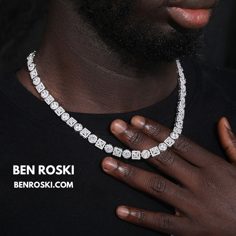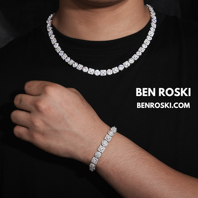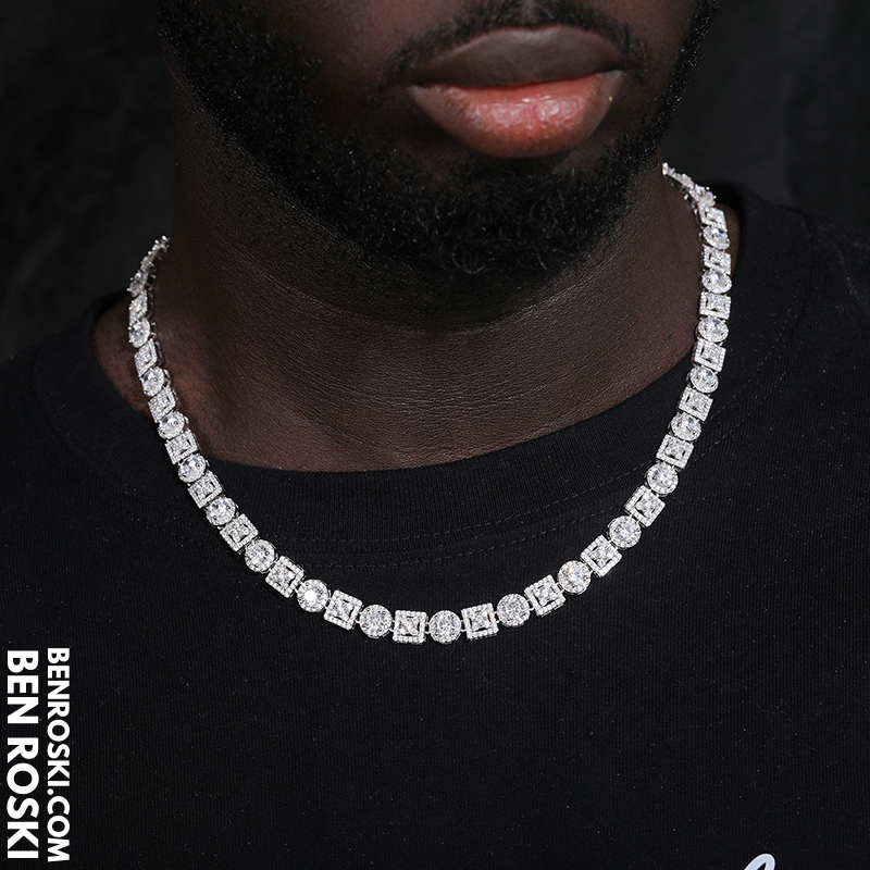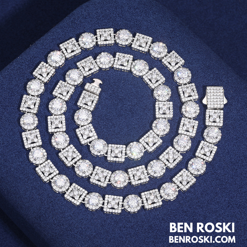 Turn every outfit into a statement with the Moissanite Cluster Link Chain from Ben Roski. Featuring a bold alternating pattern of square and round links, this chain is fully iced with GRA-certified moissanite stones, delivering unmatched brilliance that rivals real diamonds.