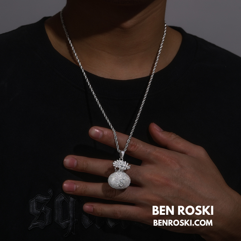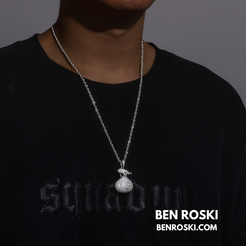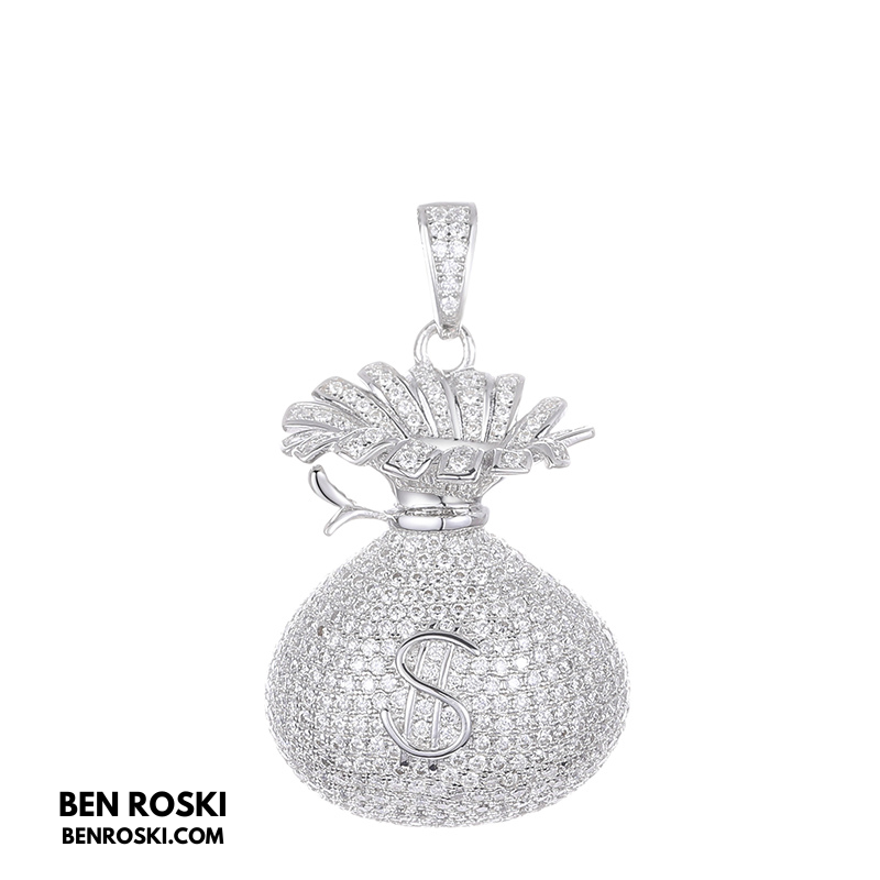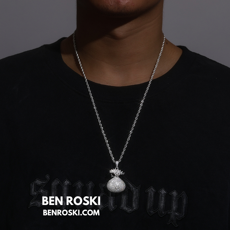 Turn heads and showcase your love for success with this 43.2MM Money Bag Pendant from Ben Roski. Expertly crafted in solid 925 sterling silver, this pendant features a fully iced-out design, meticulously handset with VVS Moissanite stones for unmatched sparkle and brilliance.
