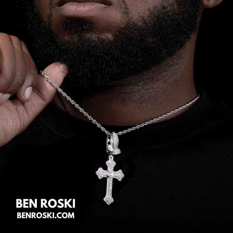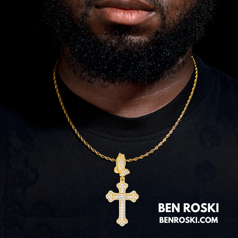 The intricate praying hands bail, also iced out with Moissanite stones, adds a meaningful touch that symbolizes both faith and luxury. Each piece is GRA certified, ensuring authenticity and premium quality.
