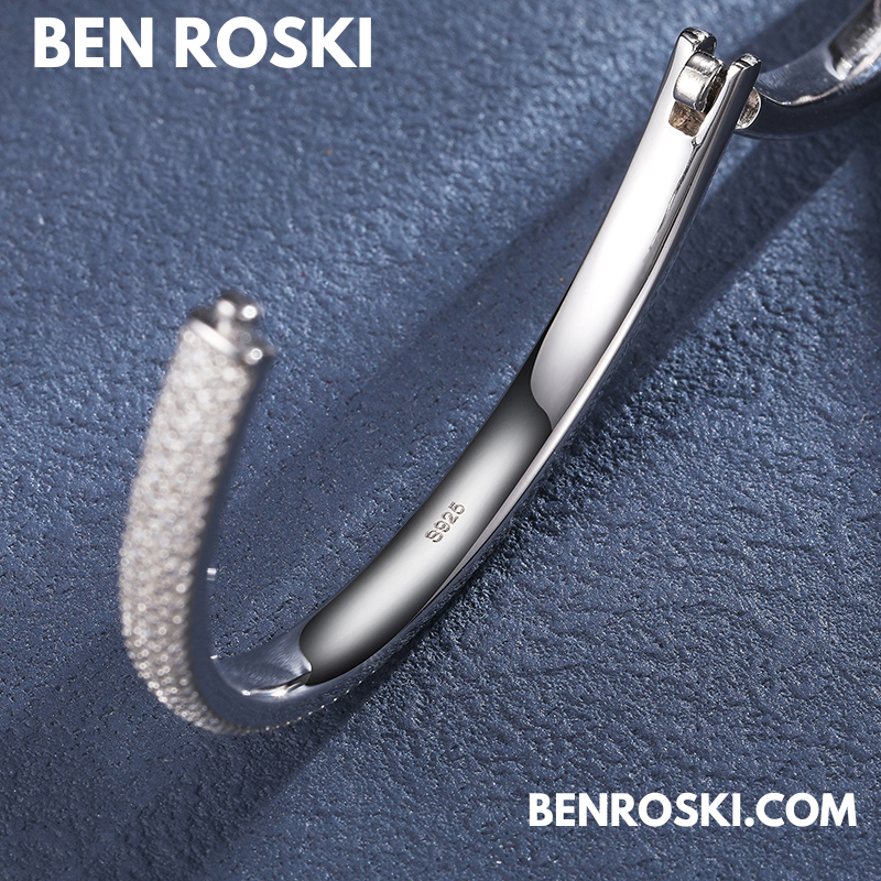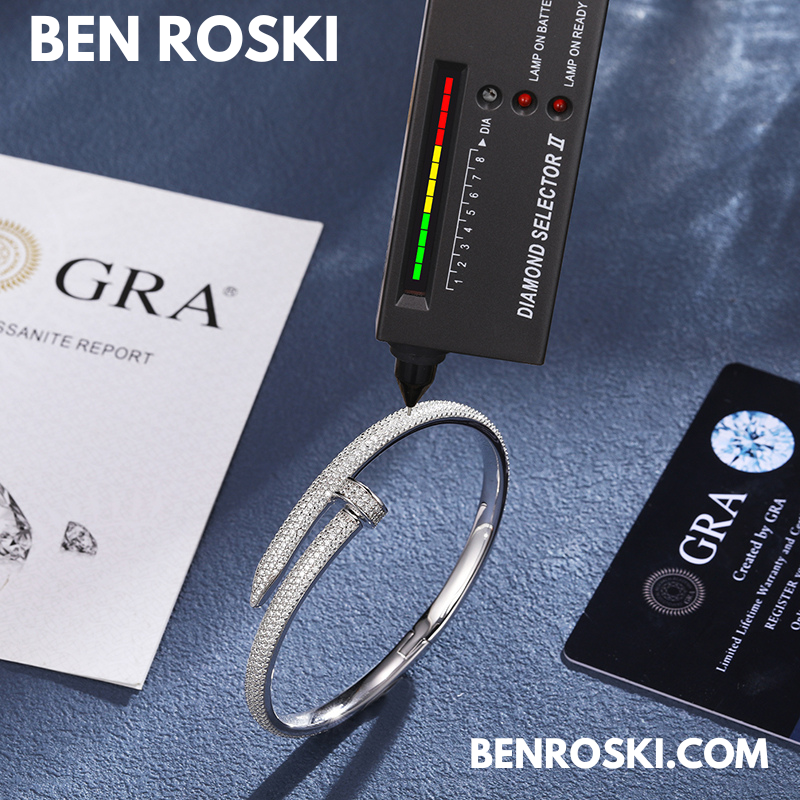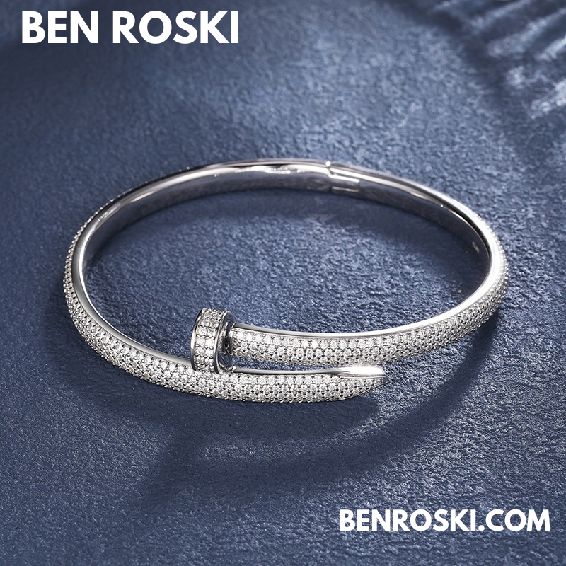 Turn heads with the Moissanite Nail Bangle from Ben Roski by Ben Roski a bold blend of high fashion and fine craftsmanship. Designed in a sleek wraparound nail silhouette, this bracelet is fully iced with GRA-certified moissanite stones and crafted from premium 925 sterling silver.